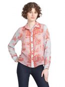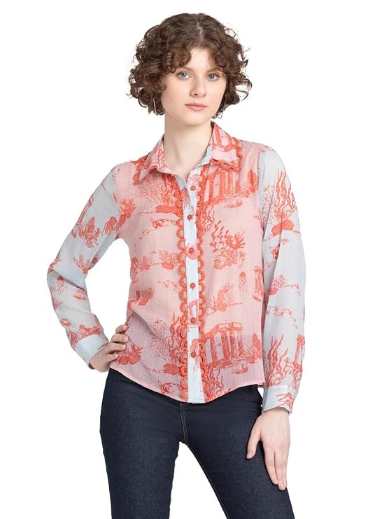 - Red floral print shirt collar long puff sleeve button-down shirt has lace detail at front and collar